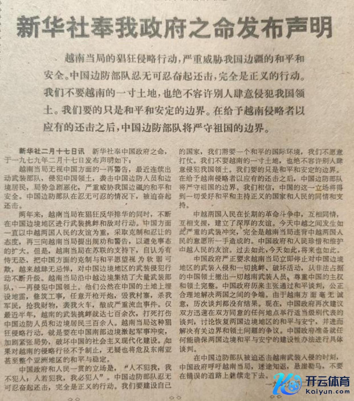 1979年2月17日,新华社奉我国政府之命,就中国东谈主民自若军被动还击越南武装入侵发布了一篇严正声明。声明中说:“两年来,越南当局在松弛反华排华的同期,握住在中国边境地区进行武装寻衅和悔怨行为。中国方面一直以中越两国东谈主民的友谊为重,选拔克制和谦敬的派头,再三向越南当局建议劝戒和告诫,以幸免事态的扩大。但是,越南当局在苏联的相沿下,自以为狗仗人势,把中国方面的克制与和平愿望视为畏怯可欺,越来越堂堂皇皇,对中国边境地区的武装侵犯行为握住升级。”